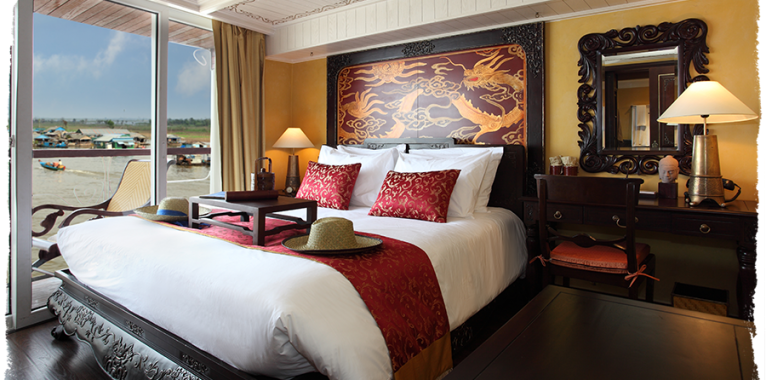 Located on the upper deck and with a floor space of 24sqm the 11 Deluxe Staterooms (3 twin, 8 double, 1 connecting) with own balcony (5sqm) offer an in-room bathroom which is separated from the sleeping area by a mighty wooden sliding door. The very warm tone of the cabin designed with dark weighty antique furniture or the hand made, rustic copper sink in the bathroom bring back the feeling of the 1930s Indochine lifestyle.